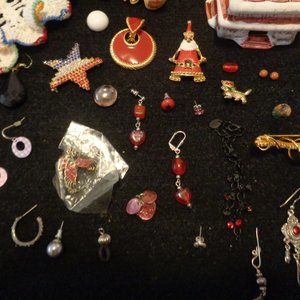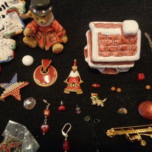 THIS IS SUCH A FUN LOT. WE DO NOT BREAK UP LOTS NOR BUNDLES. MOST ITEMS ARE VINTAGE OR RETRO. MOST HAVE WEAR SOME MORE THAN OTHERS. OF NOTE: CUTE VINTAGE HAND MADE DOILY. BRITISH BEAR WITH HAT. LOT OF JEWELRY PARTS AND PIECES TO REDO REMAKE RECREATE RENEW RESELL. SINGLE EARINGS TO BE MADE INTO SOMETHING ETC. ENJOY THE FUN. 2ND GROUP. THANKS