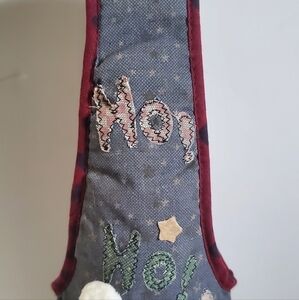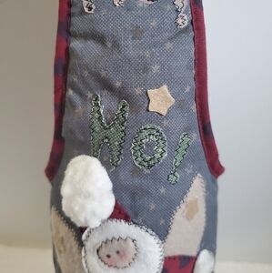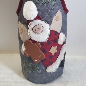 Christmas Holiday Wine Holder Bag. Santa, fluffy white trim, angel wings, wooden gingerbread, stars & Ho Ho Ho images. Blue with burgandy red trim with 2 toned star imprints. Approximately 4" in diameter & 13.5" tall. Made of cotton & polyester blend. Like new condition!