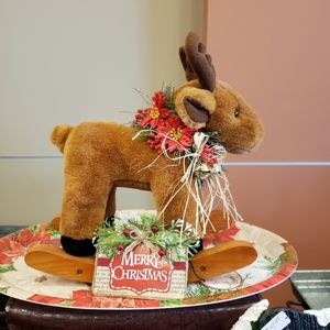 Stuffed rocking Moose all decorated for Christmas with a Merry Christmas sign that is loose and can be placed anywhere. Christmas tray it is sitting on is included