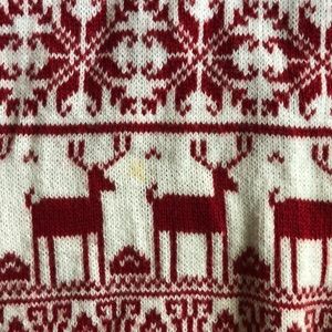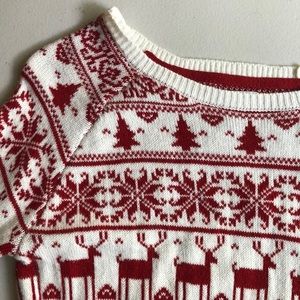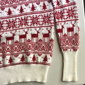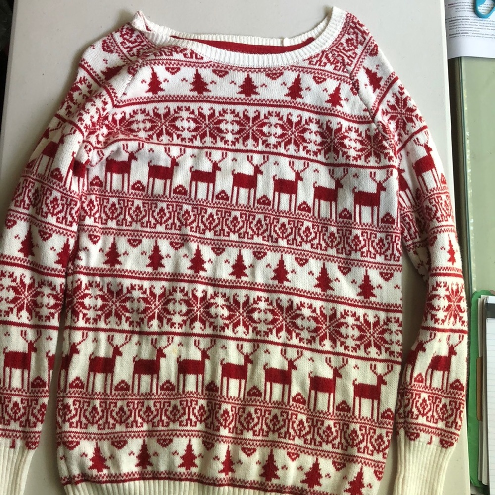 Red and white Christmas crew neck sweater. 1 very small yellow stain on front (pictured). Wide scoop neck. Soft and cozy:)