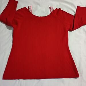CHRISTMAS Sweater Medium Peak-a-Boo Shoulder Bedazzled Red 3/4-sleeved Tunic