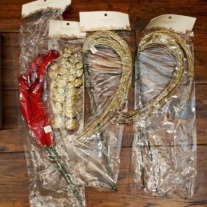 Comes with 4 items 2 Long Golden beaded with jewels at the ends and one red beaded with jewels and one gold leaf filler
