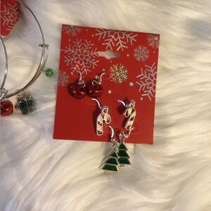 #7 Christmas gift, santa, reindeer, jingle bells-charm bangle bracelets & earrings set bracelets are a set of 3 earrings are jingle bells tree and candy-cane drop earrings set refer to photos for approximate measurements and more details all new never worn