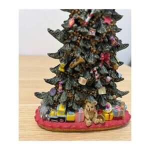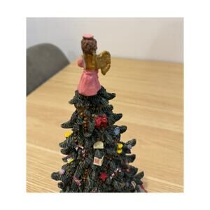 This item is an 11-inch tall resin figurine. It features intricate hand-painted details including an angel tree topper and presents. The angel on top is missing a wing, but other than that in good condition.