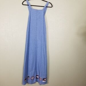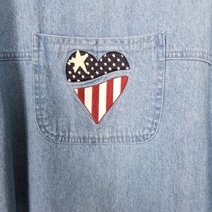 Denim Dress With Red White & Blue Stars and Stripes. One Chest Pocket and One Side Pocket. There is a Zipper on the Side of Dress. Small Stain See Last Picture.