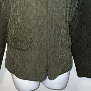 Forest green quilted jacket with fold over collar, zip closure, flap pocket at each hip. Washable polyester. Excellent condition. Size large, measures 20” from armpit to armpit and 24” from top of shoulder to bottom hem.
