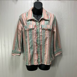 Women’s Christopher & Banks striped canvas Pearl snap shirt with frayed details. EUC, Size medium