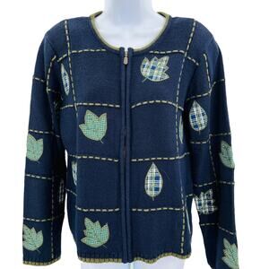 CHRISTOPHER & BANKS VTG Blue Green Patchwork Hand Embroidered Zip Cardigan Sz M