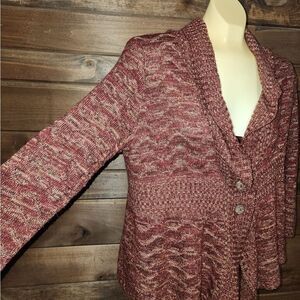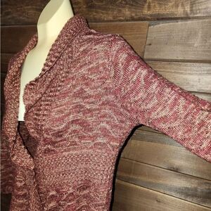 Christopher & Banks 3/4 sleeve cardigan with two buttons at the mid waist of the blouse. Color is a maroon and brown mix, skze PETITE MEDIUM in great condition.