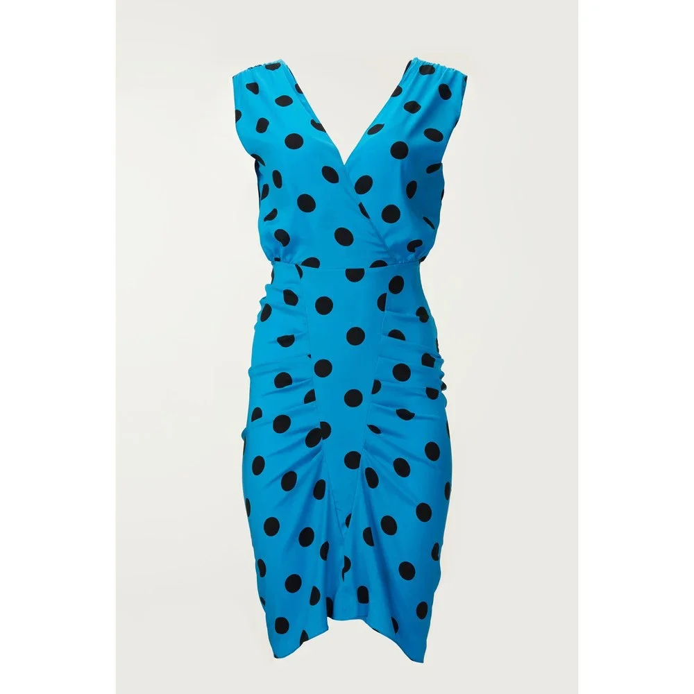 This 'Christy' dress has the most flattering fit - it will quickly become your favorite for brunches and bridal showers. It's cut from blue silk with exaggerated black dots. It is ruched throughout and has a complimentary V-neckline. Wear it with ankle boots and a leather moto jacket for cooler temperatures or pair it with sandals for warmer days.