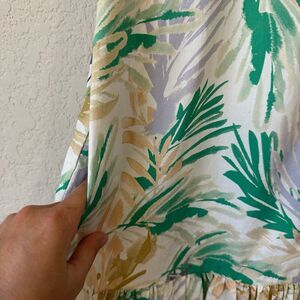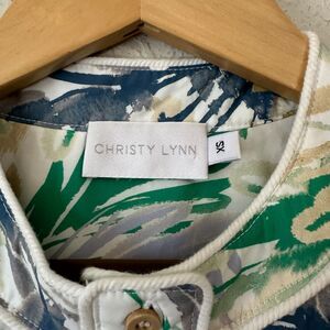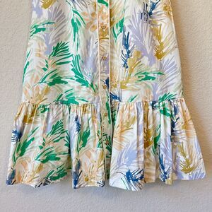 This beautiful dress by Christy Lynn features a vibrant floral pattern in multicolor leaves, perfect for any occasion. The dress has a round neckline, short cap sleeves, and a button closure. It is made of 100% cotton material and has a dry clean only care label. The dress is a size XS and has a shift and shirt dress style, with a short length. It also features ruffle accents, pockets, and button details. This dress is ideal for travel, holy communion, party/cocktail, or casual wear. The dress is not vintage and was made in China.