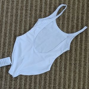 This is a fun suit for summer it is new with tag but not perfect. There are some flaws pictured in last three photos. There are a few small snags on front; an ink imprint on the inside back of the suit but it can't be seen as you wear, and some sticky residue where the panty liner was removed. Overall, very cute scoop back design. Enjoy!