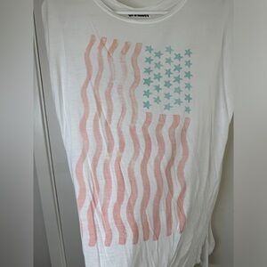 Light weight, crew neck, side slits, short sleeve, stretchy, soft, raw hem, American flag in wavy design, USA, patriotic, Fourth of July