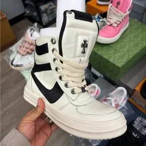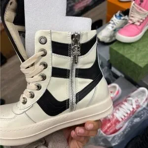 Stylish white and black high-top sneakers with lace-up design. Features a unique emblem on the side.