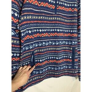 * It features a geometric pattern in a multicolor design with a collared neckline and long sleeves.