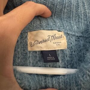 Chunky blue sweater from target. Size L for an oversized fit. I wore a lot and super warm has tons of life left I just want to upgrade some sweaters!