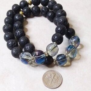 Made with extra large black Lava Rock Beads for wearable aromatherapy, gold tone spacers. The focal beads are 3 substantial, iridescent shimmering oval glass beads with an aurora boralis top coat, that makes them reflect light in the blue to green to purple color range - all subject on the lighting situation, the color of clothes you wear and your skin tone. My photos do not do these gorgeous beads justice! In the right light - they literally glow!