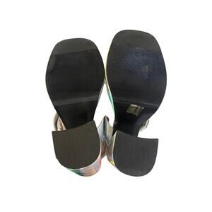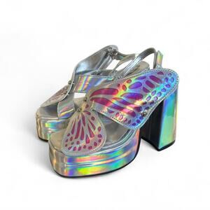 SO FUN! 4.5" BLOCK CHUNKY HEEL, 2" PLATFORM. SILVER WITH RAINBOW SHIFTS IN THE LIGHT, AND OUTSIDE FOOT HAS PINK BUTTERFLY WINGS. NO BRAND.