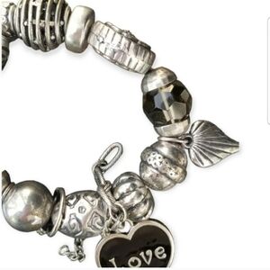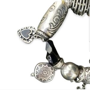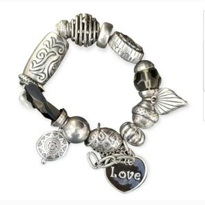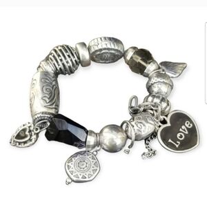 Cute chunky charm bracelet made up of silvertoned brass beads in various shapes and sizes as well as heart charms in various designs and sizes. Bracelet also has two large faceted glass beads in black and champagne. Bracelet is stretch and fits most.