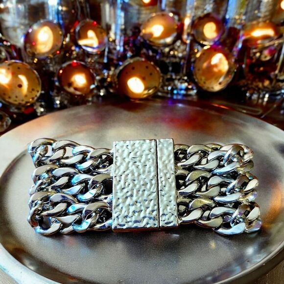 Special Features: Silvertone Finish, Chunky Links, Triple strand, Hammered details, Magnetic Closure, Substantial Weight. Edgy Vibe. Love it! ❤️