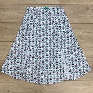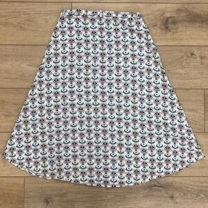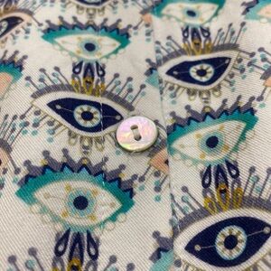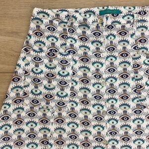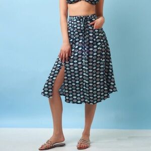 Gorgeous Brazilian made button front midi skirt by Cia Marítima. This fun skirt features two front slits for a breezy and tropical feel and a stunning eye pattern fabric in aqua peach and navy. The buttons are genuine mother of Pearl with gorgeous shimmer. Perfect modern way to rock your costal boho with an astrological twist. This runs very small, fits a 27” natural waist, labeled a Size Large