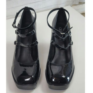 CIDER CHUNKY HEELED TRIPLE STRAP MARY JANES IN PATENT BLACK FAUX LEATHER, SZ 9