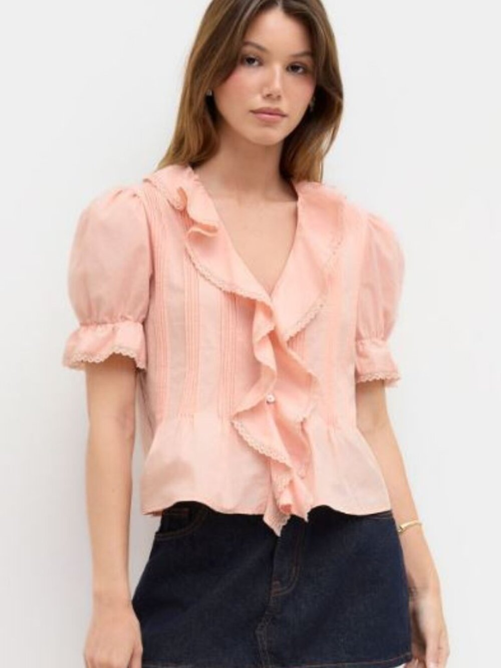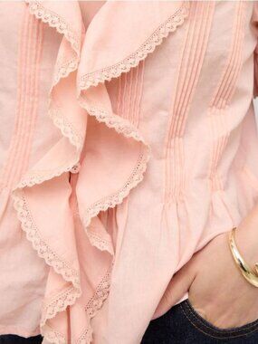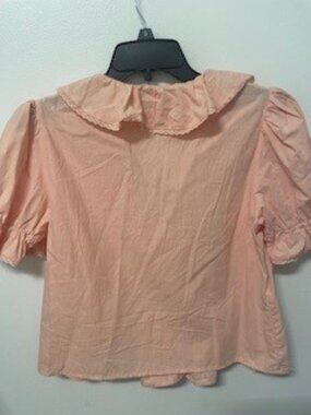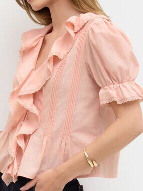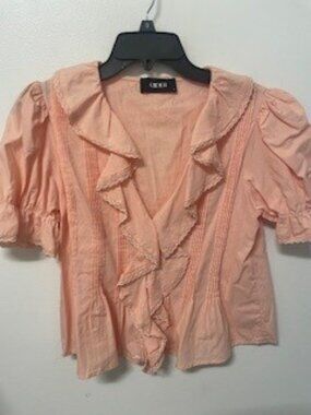 CIDER, S, PEACH, V-NECK BUTTON DOWN SHIRT, SHORT SLEEVES, RUFFLE & PINTUCK DETAILS