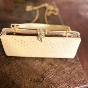 Beautiful square quilt stitched Swarovski embossed evening bag/ clutch with Swarovski encrusted gold latch and removable gold shoulder strap satin lined with card slots and a zip pocket.
