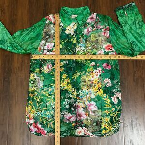 CIENNA Floral Shirt Green Button Up Roll Tab Sleeve Satin Silk Boho