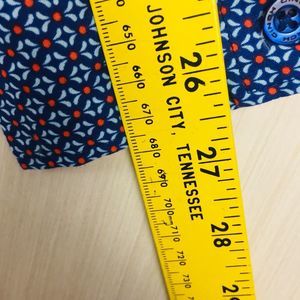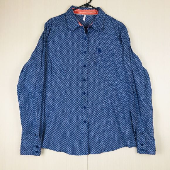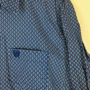 Add some color to your wardrobe with this navy blue shirt featuring a blue and red geometric pattern. This shirt has a button-down collar and long sleeves with button cuffs, perfect for any occasion. The shirt is made of comfortable cotton knit fabric and has a custom fit. It also features a chest pocket for your convenience. This shirt is machine washable and is suitable for all seasons. It is available in size XXL and is from the brand Cinch. Whether you're traveling or at work, this colorful shirt will add a touch of style to your outfit.