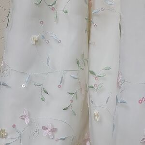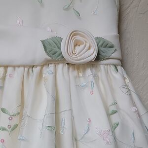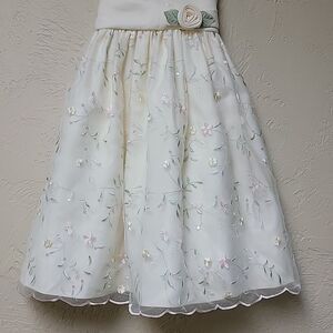 Gorgeous Cinderella ivory special occasion dress, can be worn as a Flower Girl dress! Features lined polyester bodice, skirt portion consists of four layers, sheer overlay with embroidered pastel flowers and sequins, belt has 3D flower and tie back, zipper closure in back.