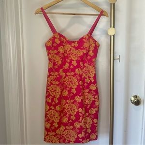 Lemon yellow and guava pink cotton blend Erica dress from Cinq a Sept featuring shoulder straps, a sweetheart neckline, a fitted waist, a short length, a straight hem and a floral embroidery.