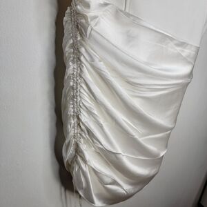 An asymmetric piece, this bodycon dress flaunts utilitarian ruching and is styled with a satin skirt, had a bridal flair as well