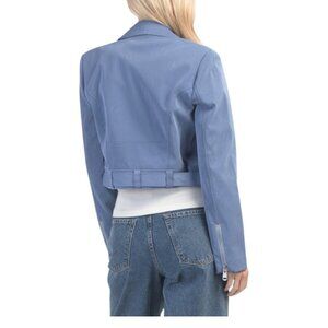 faux leather design, 2 front zip pockets, belted waist, 1 chest zip pocket, metallic detail, zip cuffs