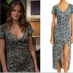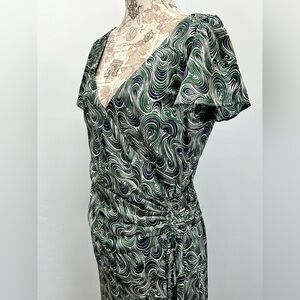 The KACYDIE navy and green swirl pattern surplice midi dress from CINQ A SEPT, size 10. Dress has a deep V neckline, ruched waist and front slit.