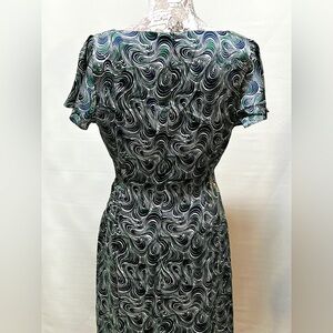 CINQ A SEPT Navy and green KACYDIE swirl pattern surplice midi dress size 10.