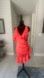 CINQ A SEPT PETUNYA SILK COCKTAIL DRESS SIZE 4. THIS BEAUTIFUL SILK COCKTAIL DRESS IN NEON CORAL, RUFFLE TRIM, OPEN V-NECK BACK, AND ASYMMETRICAL HEM WILL SURE TO STUN AT ANY EVENT. APPROX 32" FROM SHOULDER TO HEM. I AN 5"4" SO YOU CAN SEE WHERE IT HITS ON ME. SLIP ON STYLING WITH SIDE ZIPPER, SHELL 100% SILK..