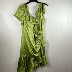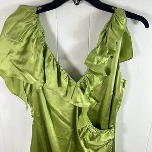 This glamorous silk dress trimmed with ruffles gathers at the