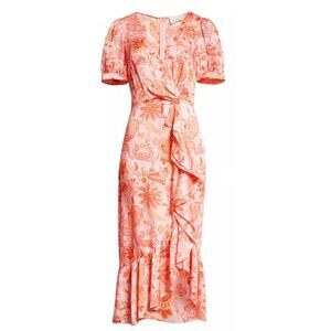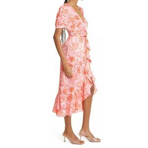 Brighten up all your boring days by stepping out in this chic and modish Kay Faux wrap dress by Cinq A Sept. A figure-skimming midi dress cut from precisely embroidered polyester material in the hues of bright peaches and pinks. Cut into a wrap-style silhouette, surplice V-neckline, short puff sleeves, and ruffled detailing at the waistline before falling into a low-high hemline. Pair yours with some high heels and make them go crazy with your every move.