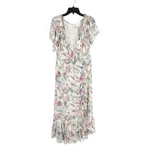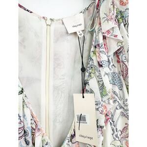 Sheila floral ruffle-trim midi dress from CINQ A SEPT featuring white, multicolour, all-over floral print, ruffled detailing, plunging V-neck, flutter sleeves, concealed rear zip fastening and asymmetric design.