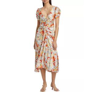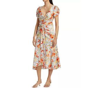 Cinq a Sept 'Walker' dress featuring a delicate linework-floral print, twist-puff sleeves, and a subtle flounce hemline.
