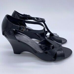 Joan & David CIRCA "CJHELAINE" Black Patent Leather Peep Toe Wedge Sandals in Size 8.5M. Excellent pre owned condition. A little cracking to insole, no other issues or flaws. Comes with original box and dust bag. Approximate 3" heel.