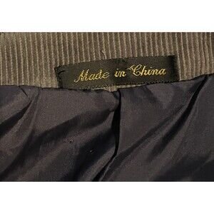 Nice western style gray corduroy jacket with black suede patches on elbows. Two buttons close the front and 3 embellish each sleeve edge. Fully lined with 2 inner pockets and padded shoulders. Has 2 flap covered front pockets still factory sealed. Has 1 vent at back of hem.