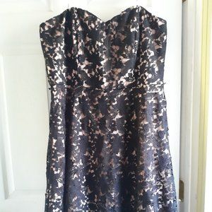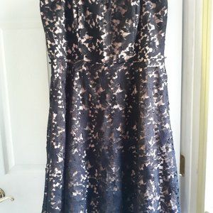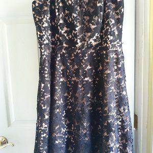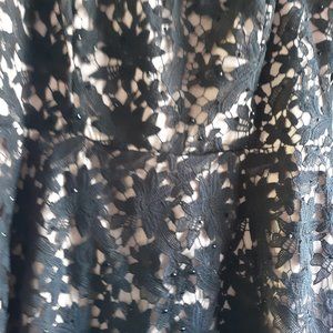Black lace fabric, fully lined in pink, back zipper, flared skirt & fitted bodice, strapless with optional straps included. Lace bodice; stretch polyester lining, crinoline attached to bottom of lining, shown in last photograph.