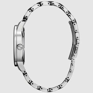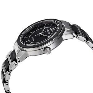 This Citizen Eco-Drive wristwatch for women is a stylish and elegant accessory that will complement any outfit. The silver and black ceramic bracelet perfectly complements the silver case and black dial. The 36mm round case houses an analog display and the watch is powered by Eco-Drive technology.