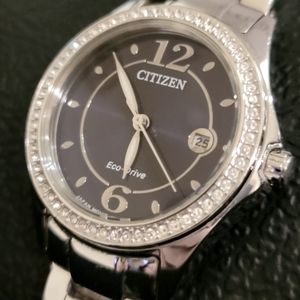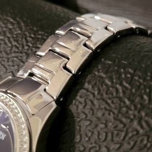 Barely worn. Some wear on band. Classic lines and a hint of sophistication allow for this CITIZEN Silhouette Crystal timepieces to stand out. Shining bright with crystals and featured in a stainless steel case and bracelet with a cobalt blue dial. Includes date feature. Featuring Eco-Drive technology – powered by light, any light. Never needs a battery.