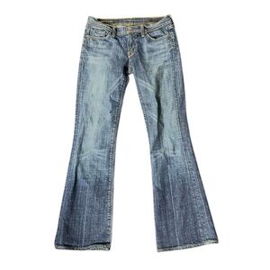 Low rise with a flared silhouette. Some distressing. Great pre-owned condition, some fading near the beck pockets.