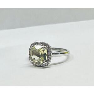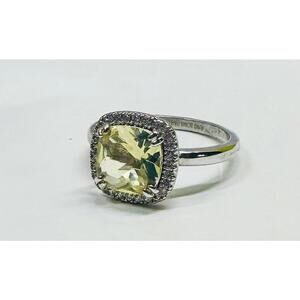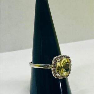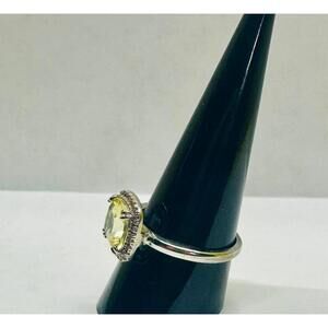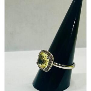 It's a cushion cut victorian classic style engagement ring that features lab created bright canary yellow citrine with white topaz accents. It's a size 9, triple rhodium plated band and hefty! It's a gorgeous ring!