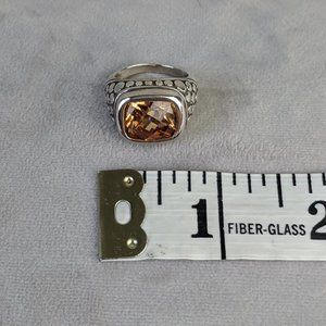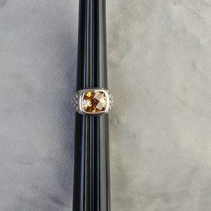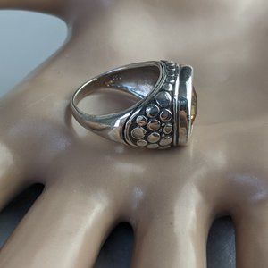 Bali designer inspired ring featuring deep yellow/brown citrine center stone nestled inside a .925 Sterling Silver dot band. This faceted citrine is truly one of the prettiest I've come across. You'll get many compliments when you wear this, especially if paired w/the matching earrings.
