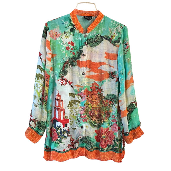CITRON SANTA MONICA COLLECTION Women's Size Large Orange/Turquoise Chinese Pagoda Tie Dye Long Sleeve Mandarin Collar. Tunic Top. Delicate Shell Buttons. Eco-Friendly Silky 100% Viscose (Plants) - Machine Wash. Hand Tie-Dyed - One-of-a-Kind Gorgeous.